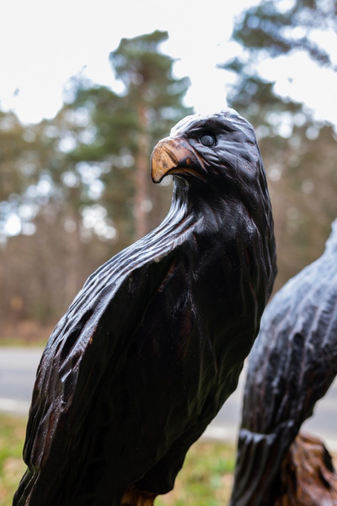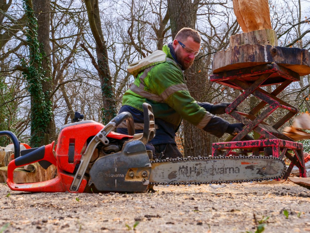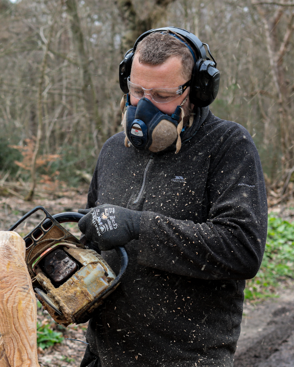 There is an unobtrusive turning on the right towards what the locals call Lion’s Mouth (a pretty spot providing you can avoid the dog-walkers) but there at certain times of year you will find Arnie Barton, a wood carver.