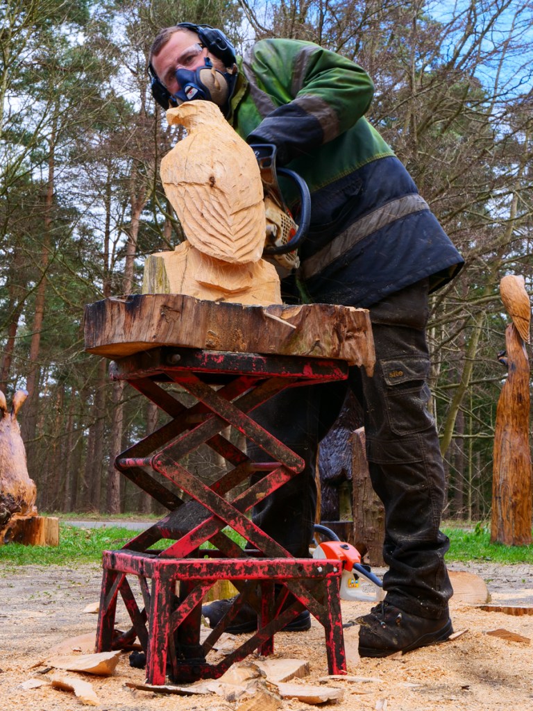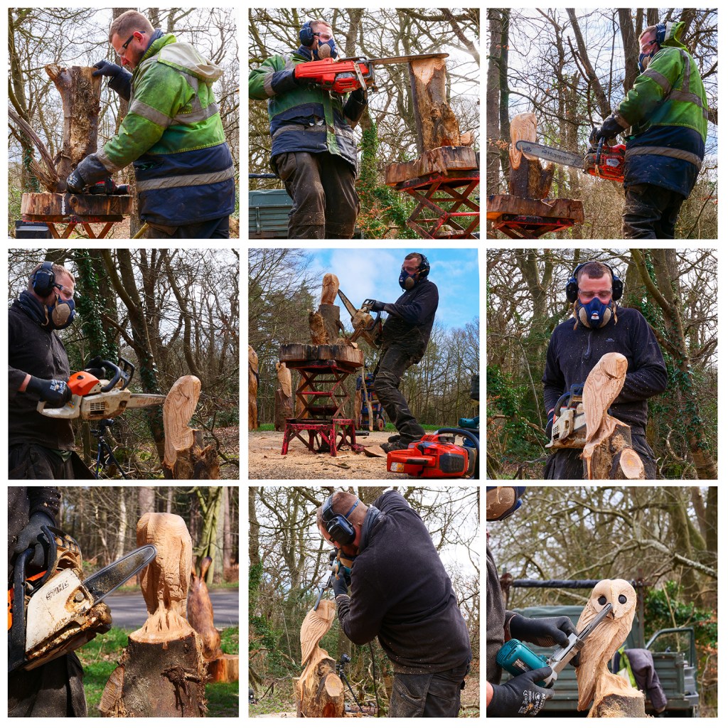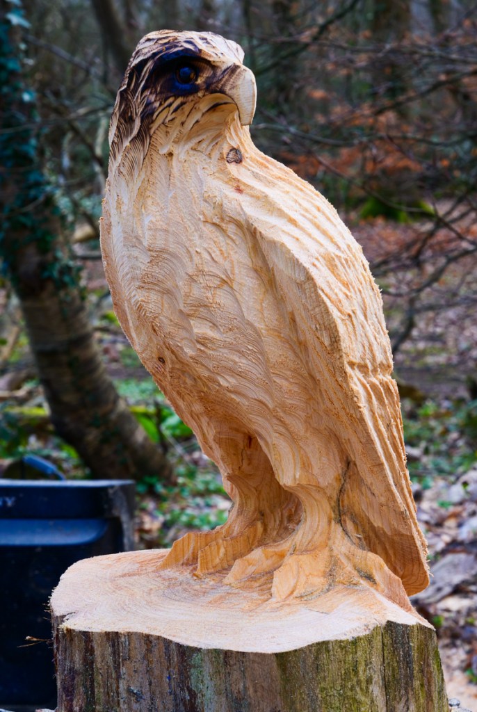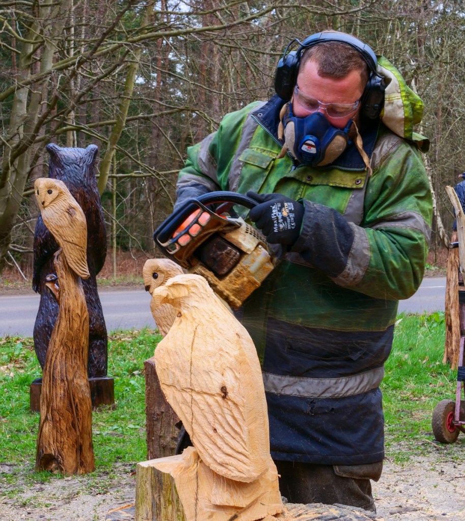 I watched in amazement as he (somewhat noisily) carved from part of a tree-trunk a wooden owl, etching out feathers, claws and even sockets for the eyes. It was quite a speedy affair as lumps of wood were hacked away with great skill. Sawdust flew everywhere – to the extent that he felt much happier if I was offered a pair of safety glasses to keep the sawdust out of my eyes.