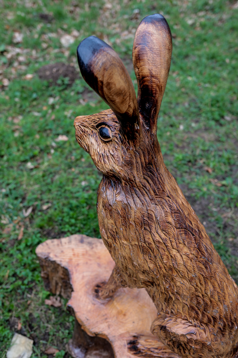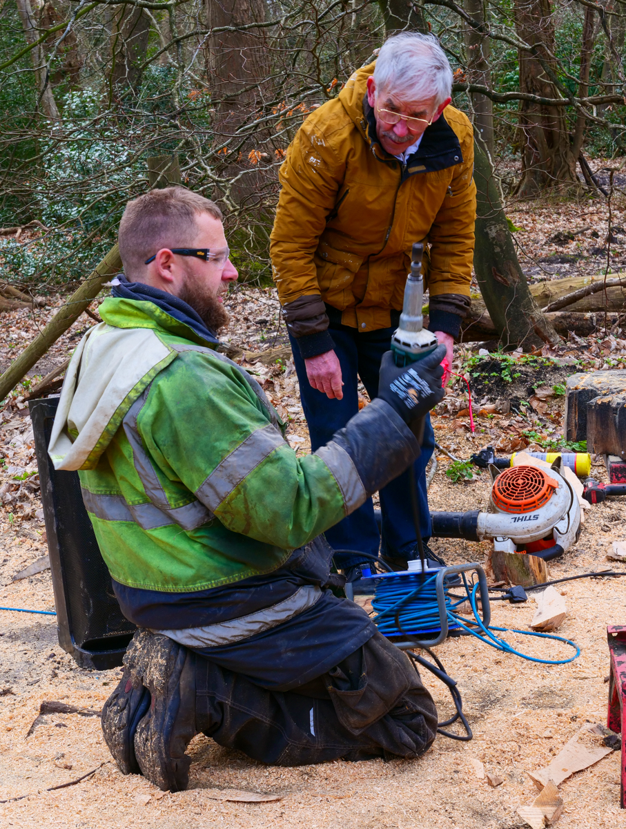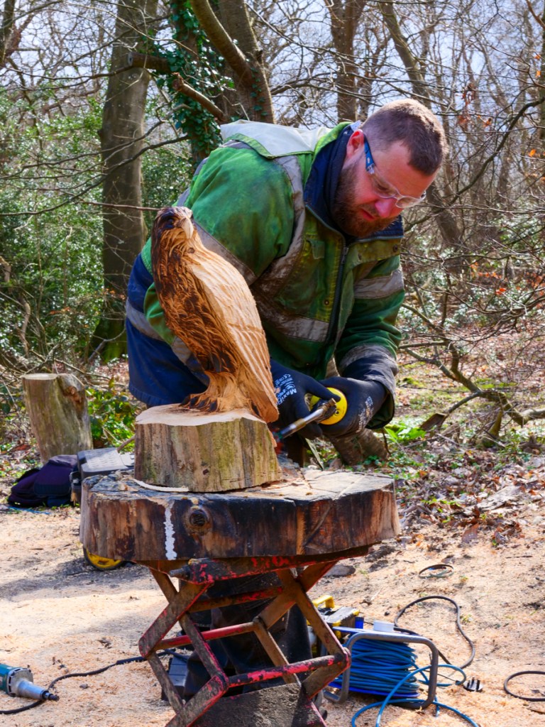 I watched in amazement as he (somewhat noisily) carved from part of a tree-trunk a wooden owl, etching out feathers, claws and even sockets for the eyes. It was quite a speedy affair as lumps of wood were hacked away with great skill. Sawdust flew everywhere – to the extent that he felt much happier if I was offered a pair of safety glasses to keep the sawdust out of my eyes.