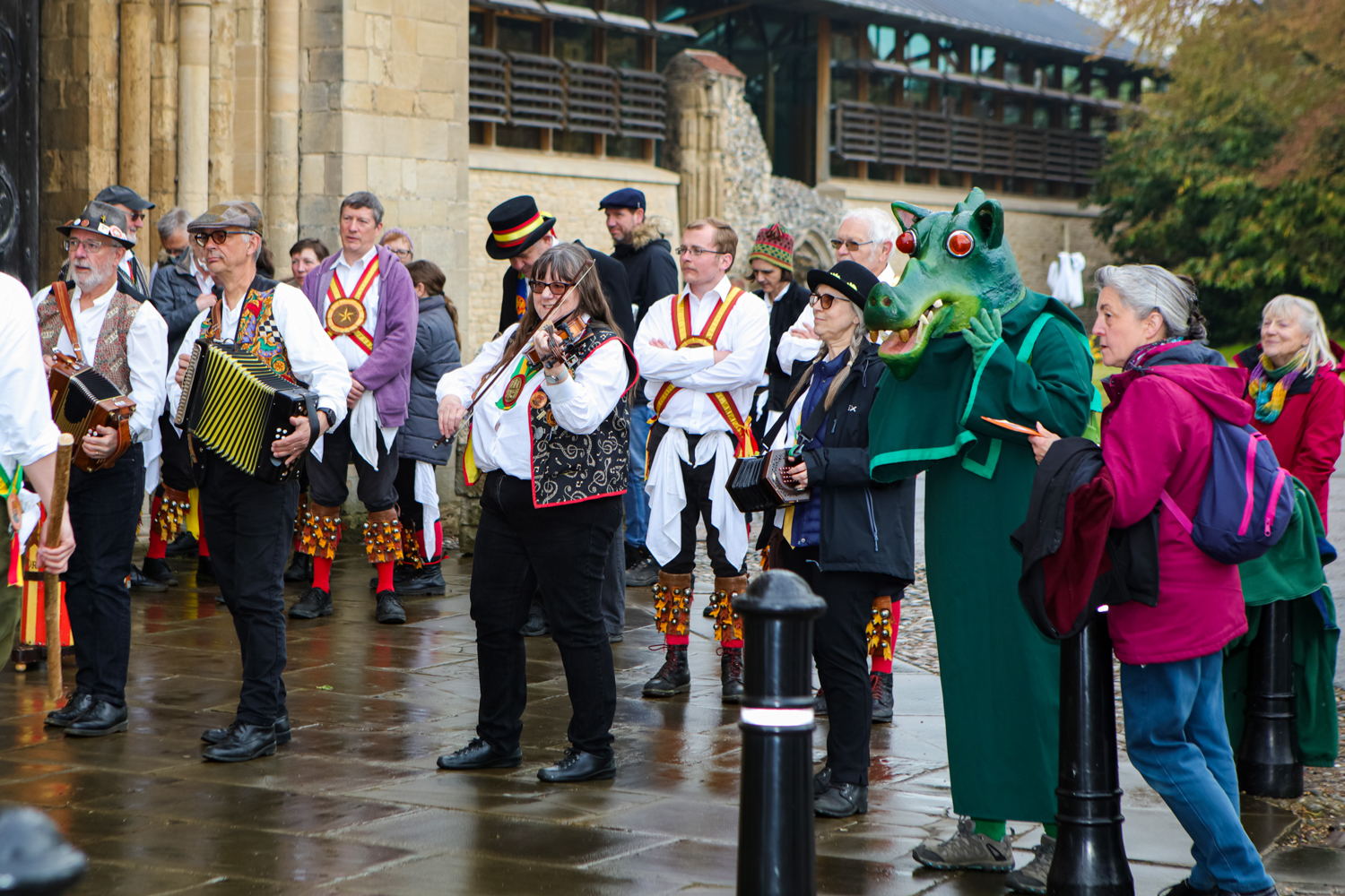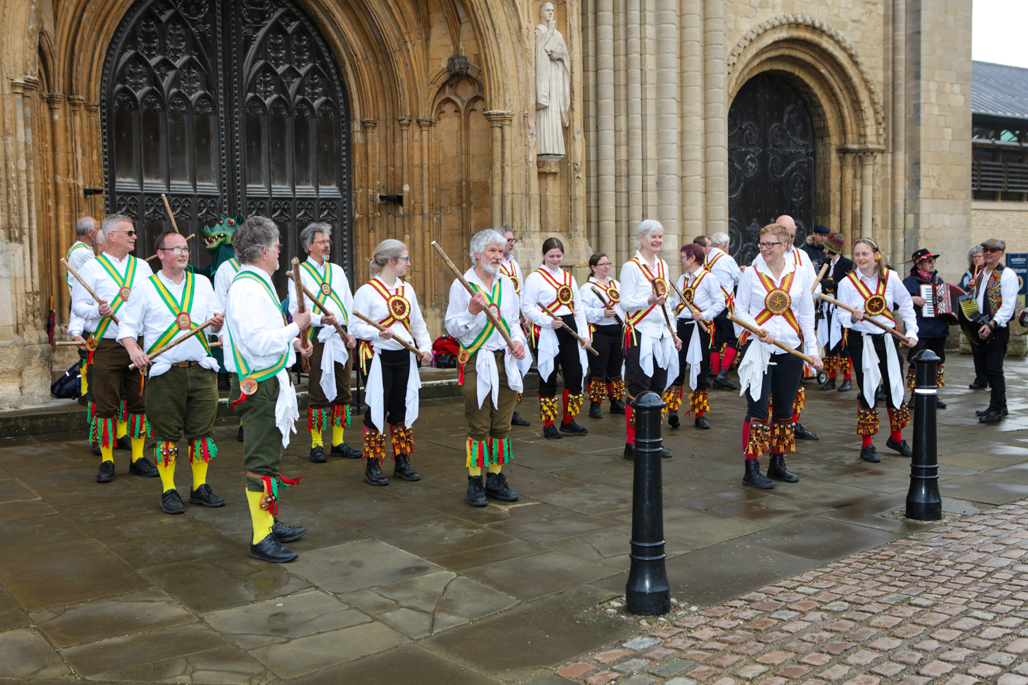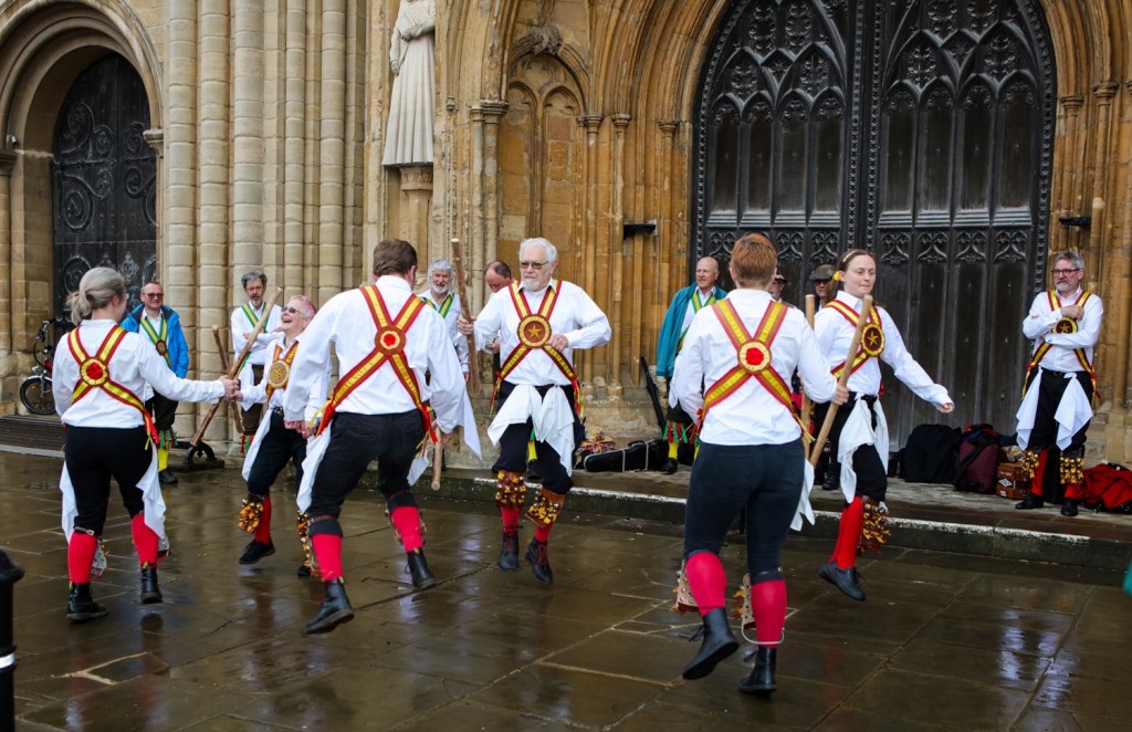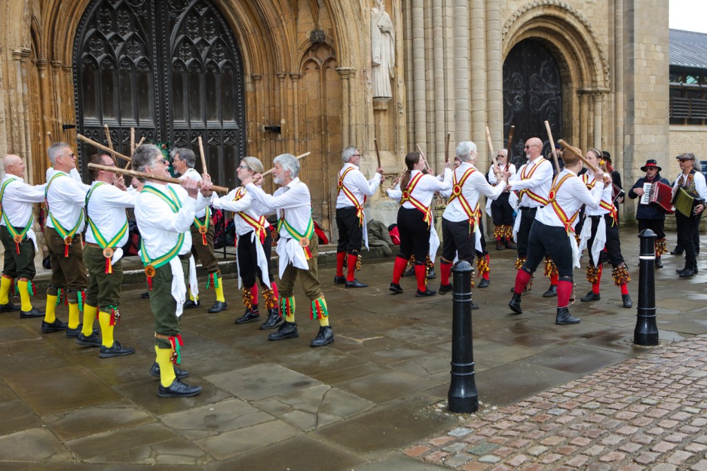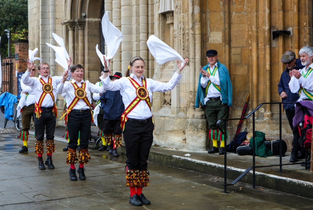 Oh you know the song “Early one morning just as the sun was rising…” Only it wasn’t – indeed the rain had just stopped falling as the Morris dancers arrived outside the west door of Norwich Cathedral to perform their music and dances at 6.30am on the 1st May.