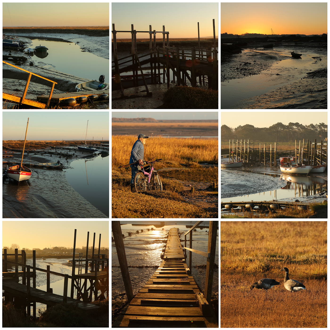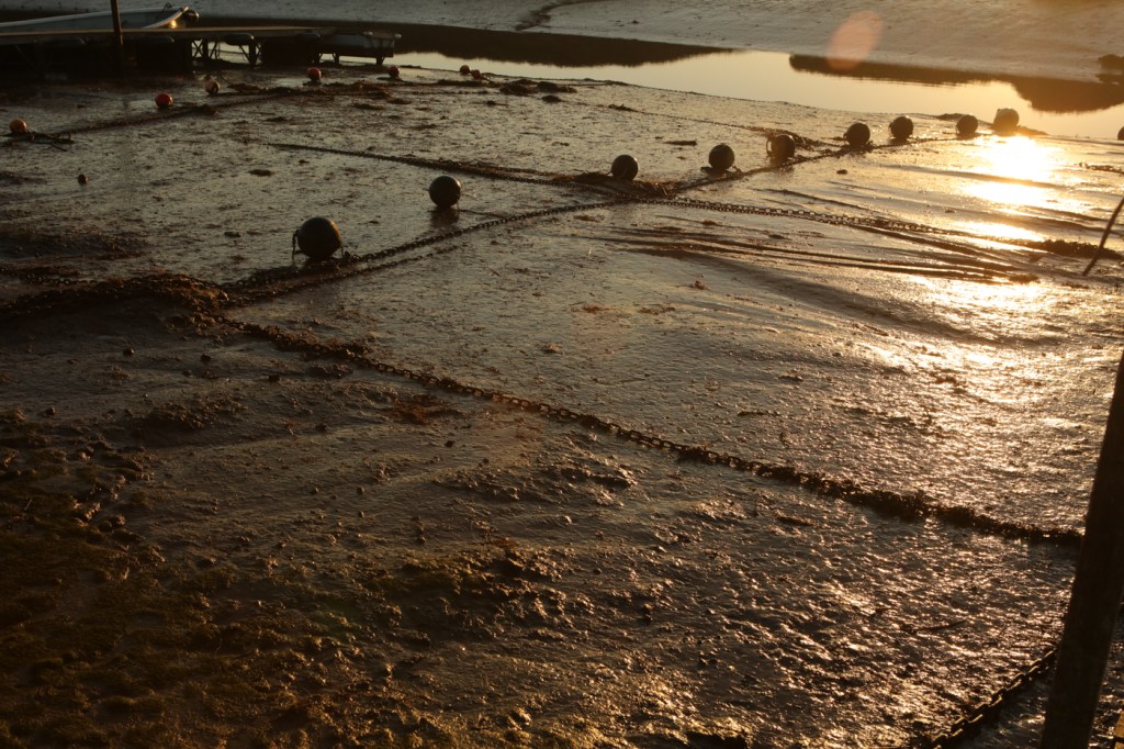 The sun reflects off the wet mud and seems to give twice the amount of light. As it rises it hides behind boats, stakes in the mud and the few building that there are, producing long interesting shadows emphasizing the three dimensional effect.