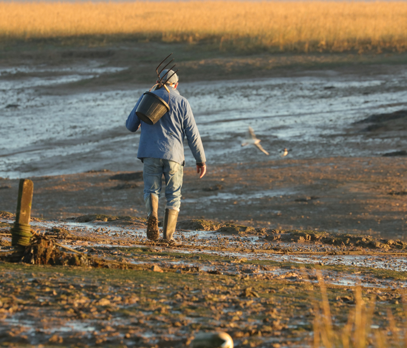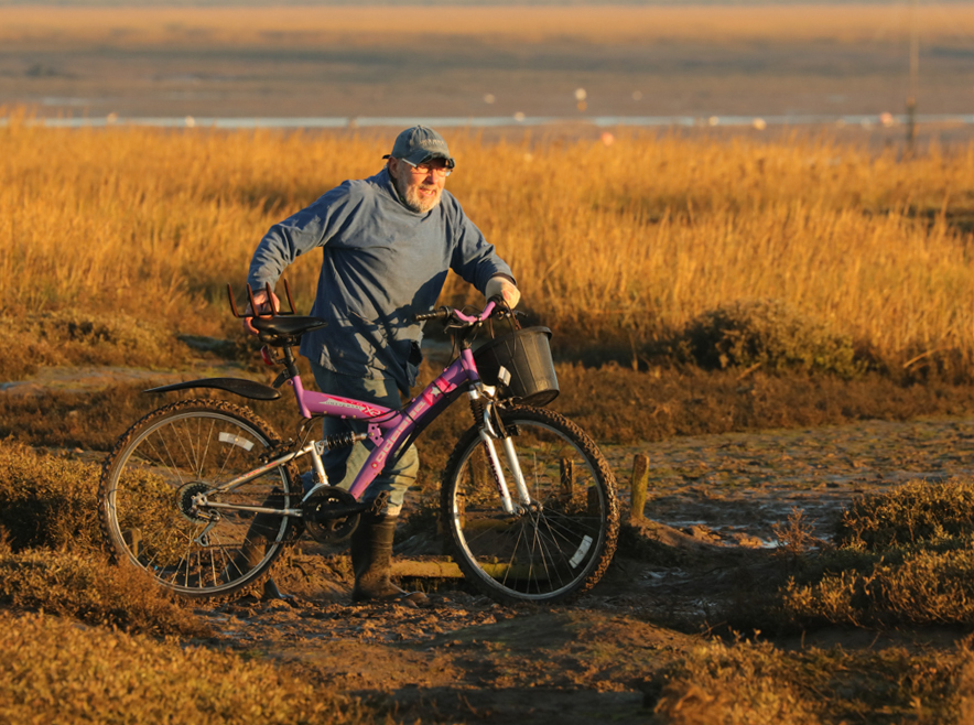 How odd! Surely he is not going to ride it across the mudflat– anyway there is nowhere to go. He’s out digging for worms to be used as bait, and the bicycle, merely a device to support his bucket and fork.