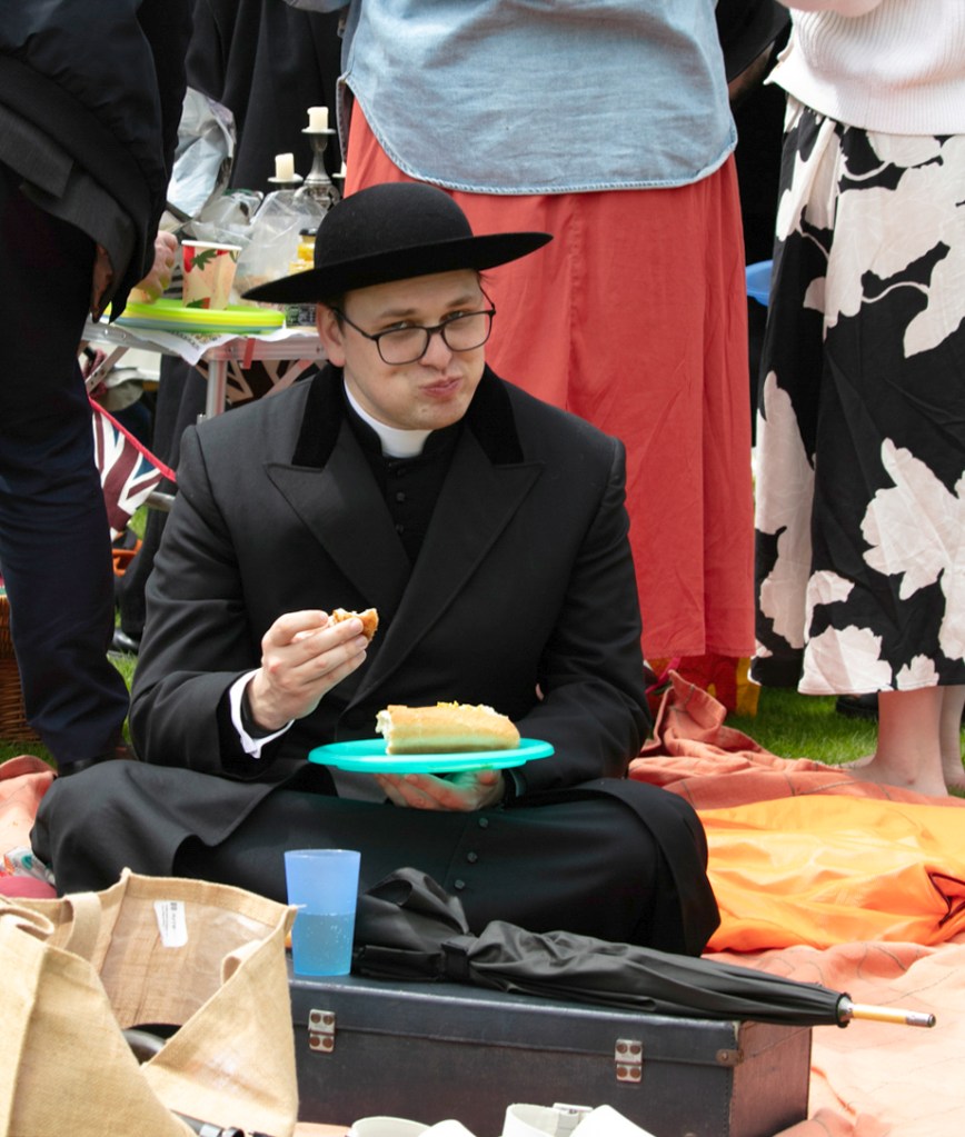 The munching that goes on is quite unmistakable. Clergy in cassocks, nuns in their habits – it’s like the feeding of the 5000 without the loaves and fishes. A real carnival atmosphere.