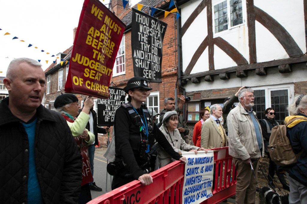 Most of the congregation join in the line up – that is apart from the aged and infirm – and of course the protesters.