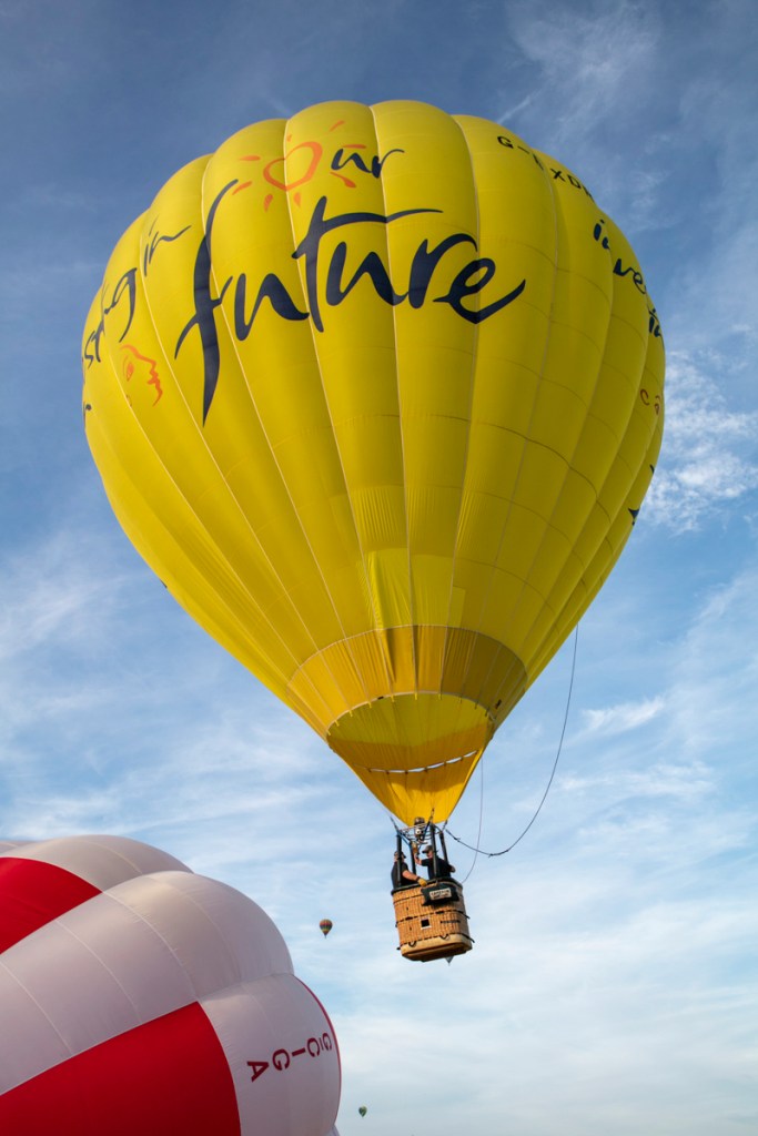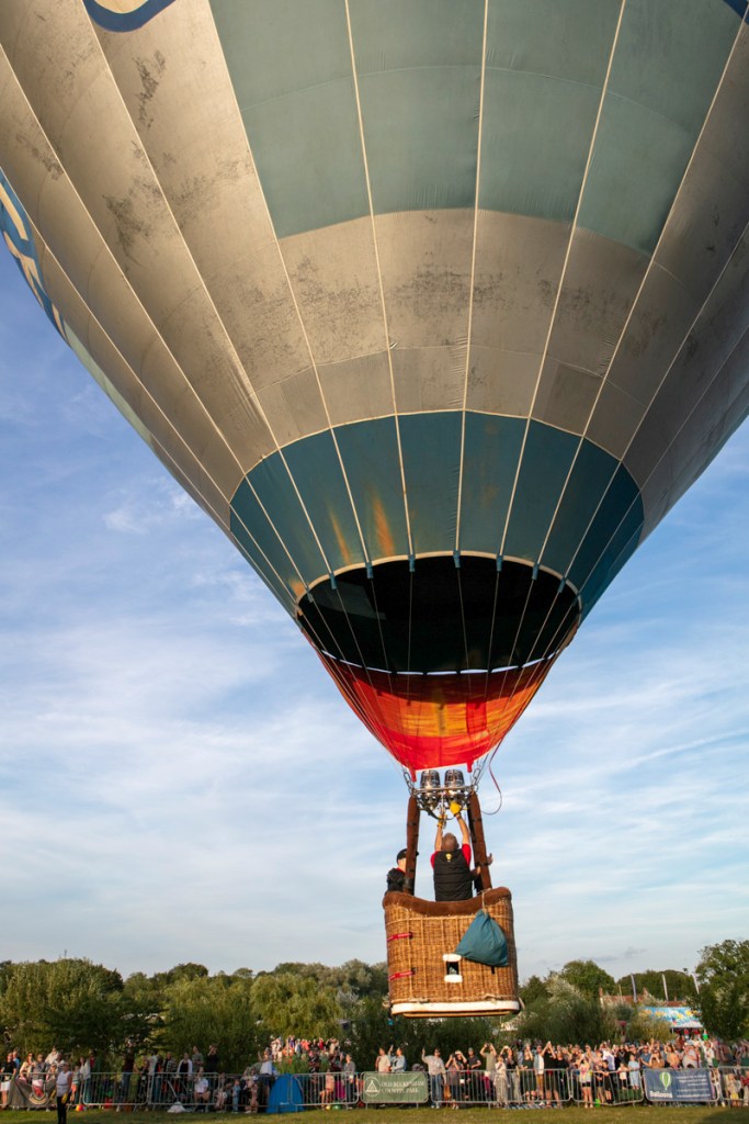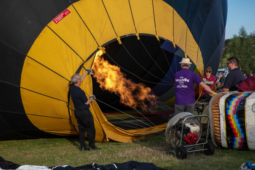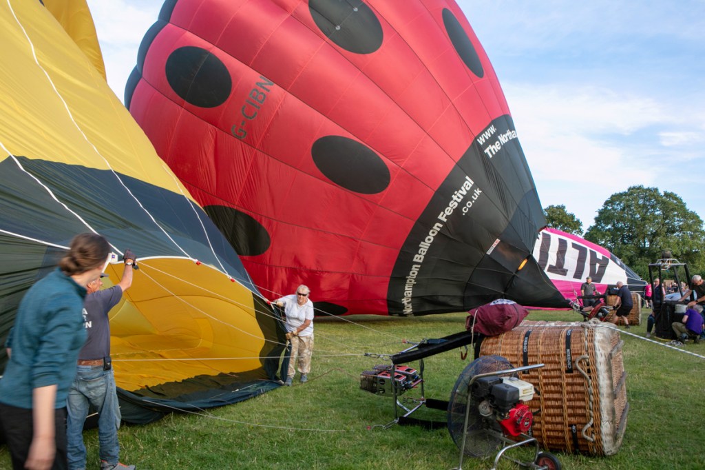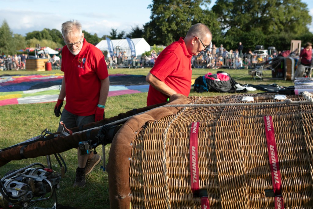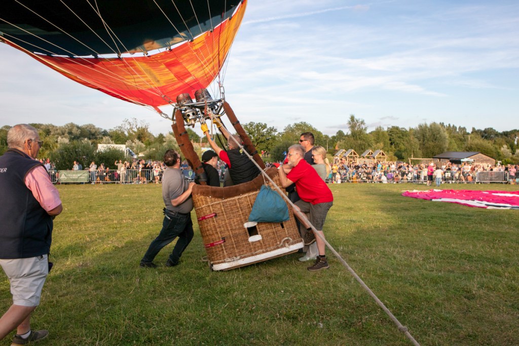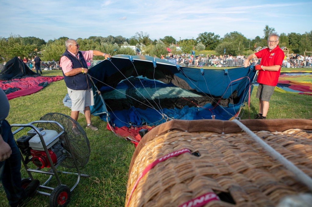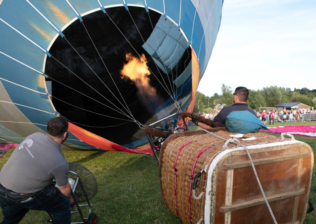 The preparation was feverish. Ground crews worked really hard to get everything right. Air was blown in to the canopies and eventually as the baskets began to tip upwards, burners were ignited and the show was more in the air than on the road.
