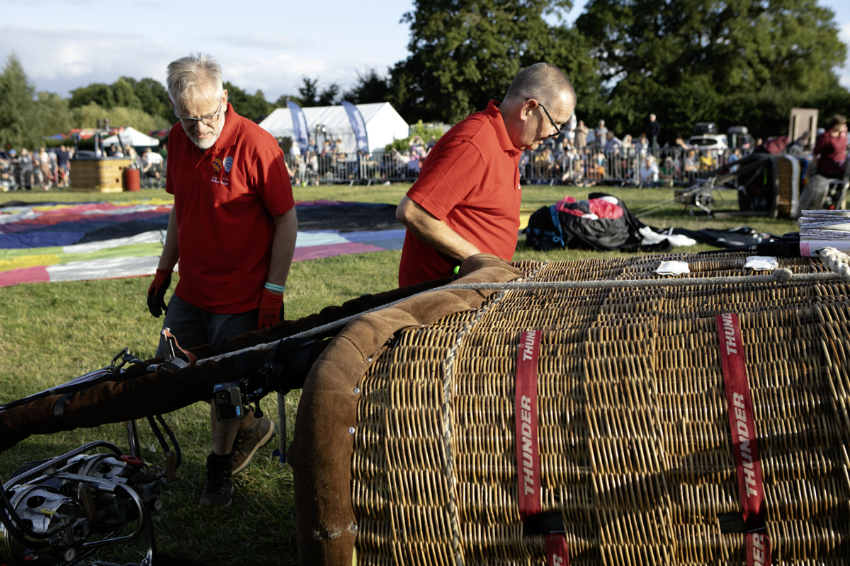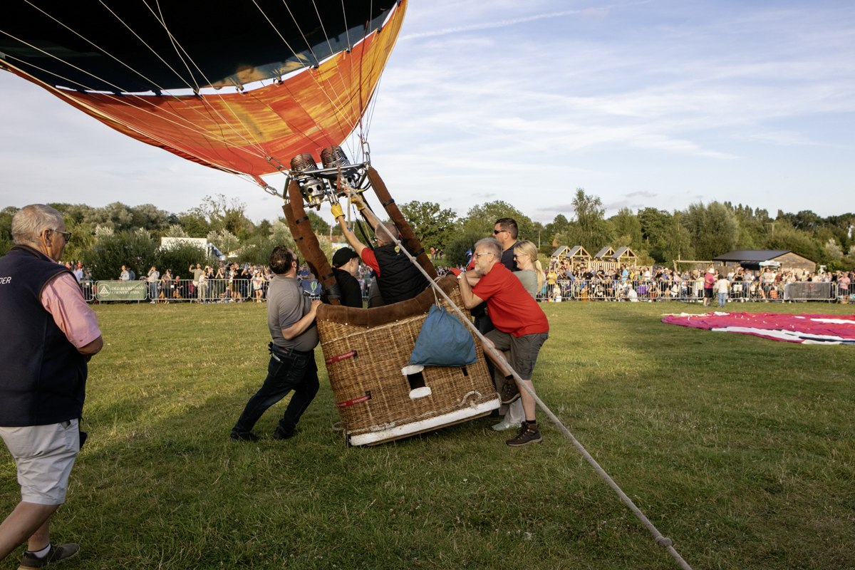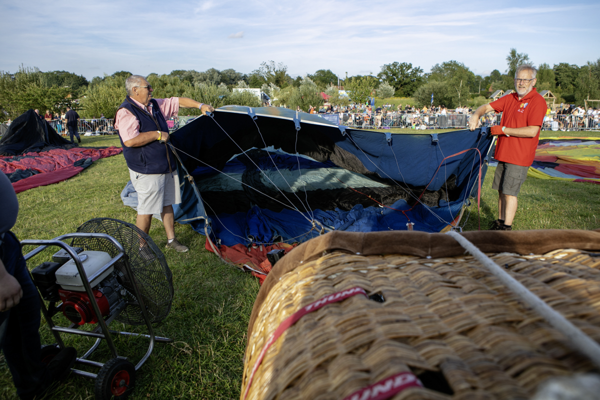 The preparation was feverish. Ground crews worked really hard to get everything right. Air was blown in to the canopies and eventually as the baskets began to tip upwards, burners were ignited and the show was more in the air than on the road.