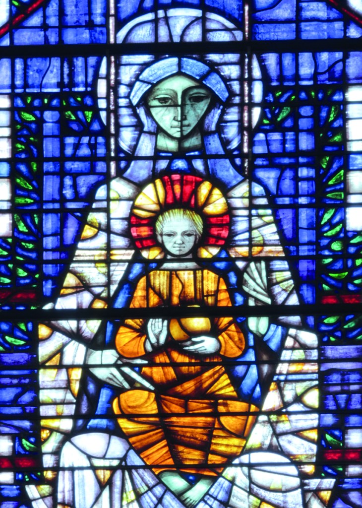 These bosses depict many biblical scenes from both the old and new testaments, but sure enough half way along the nave is the scene in Bethlehem. The other illustration may be found in the north transept – a very bold and very modern- a coloured window – but once again not always obvious to the passing tourist.