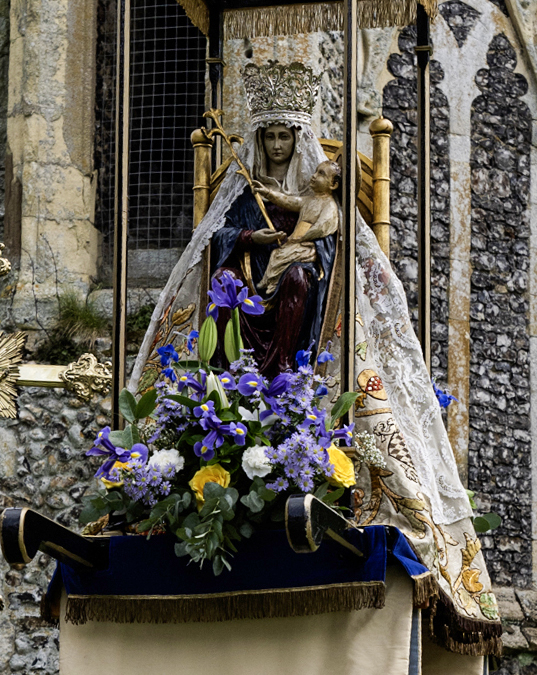 The shrine of Our Lady of Walsingham has its own take on the subject. The statue of the virgin, often carried in procession focuses on Mary as the queen of heaven – but notice in infant Jesus in her arms.
