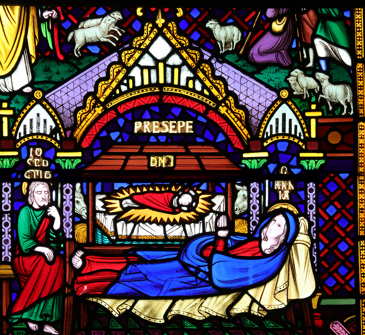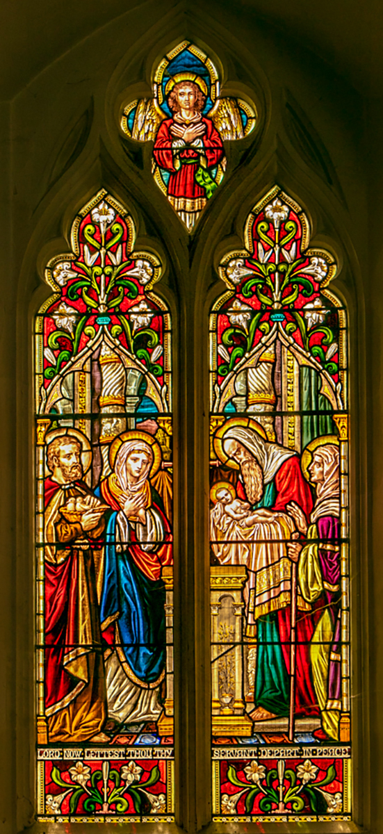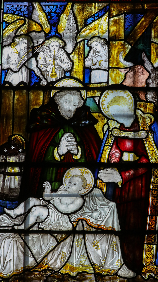 These bosses depict many biblical scenes from both the old and new testaments, but sure enough half way along the nave is the scene in Bethlehem. The other illustration may be found in the north transept – a very bold and very modern- a coloured window – but once again not always obvious to the passing tourist.