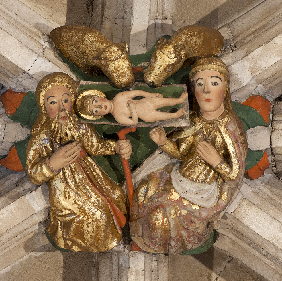 Norwich Cathedral has at least two depictions of the birth of Jesus. One is a boss constructed on the inside of the roof in the nave.