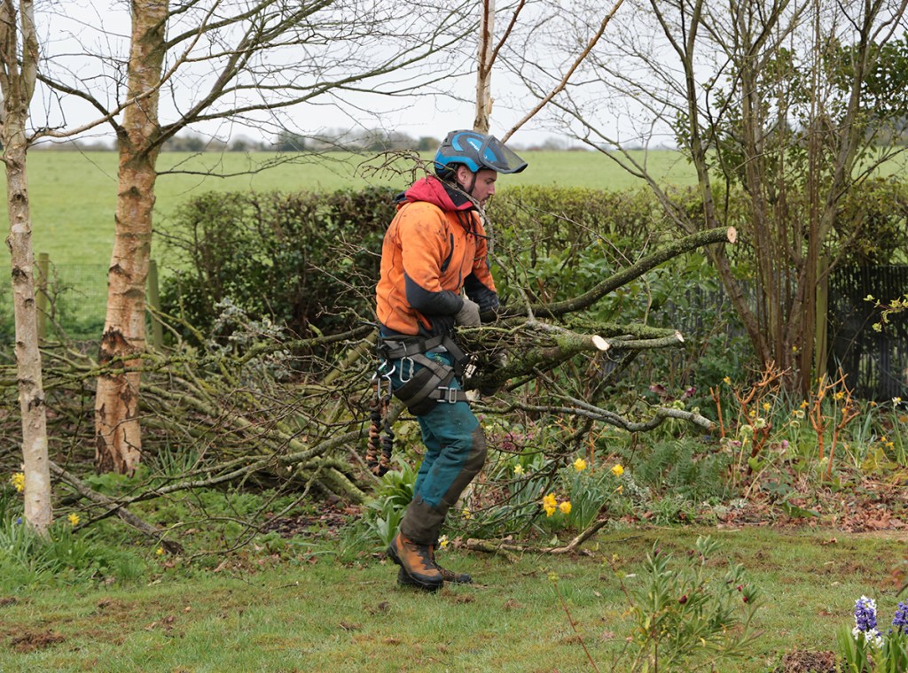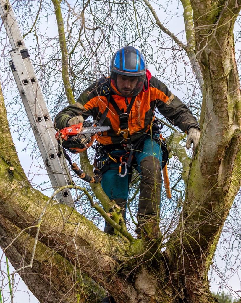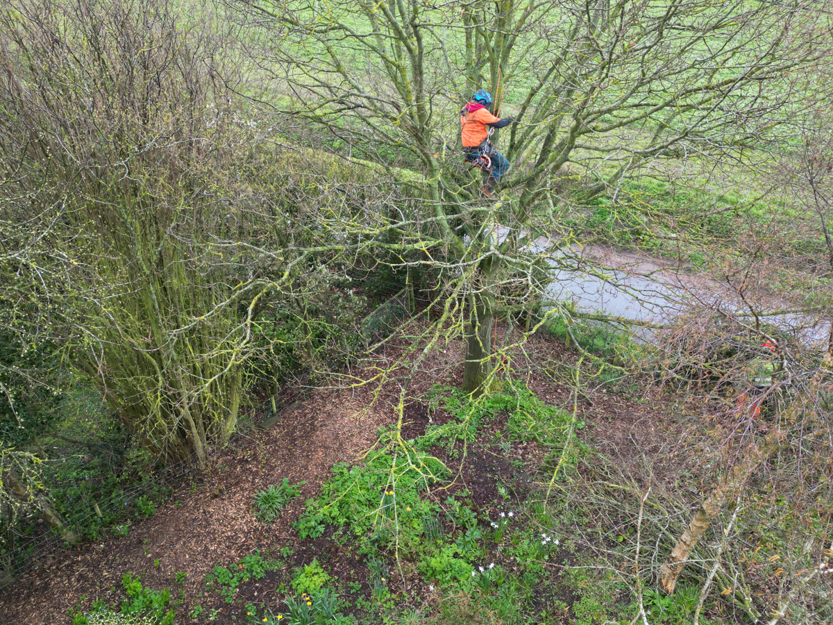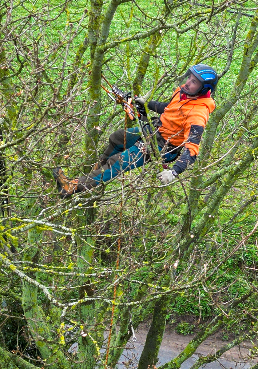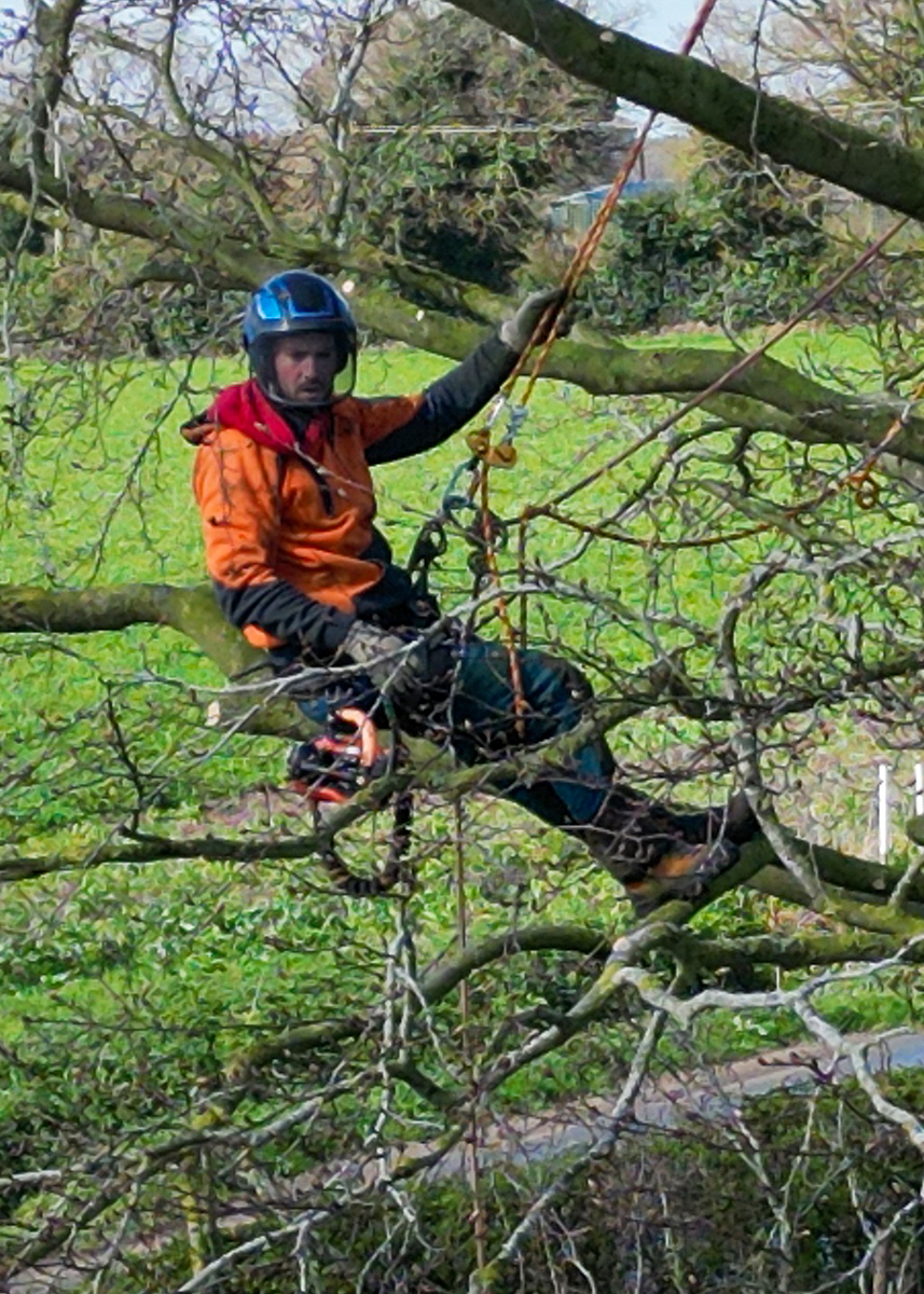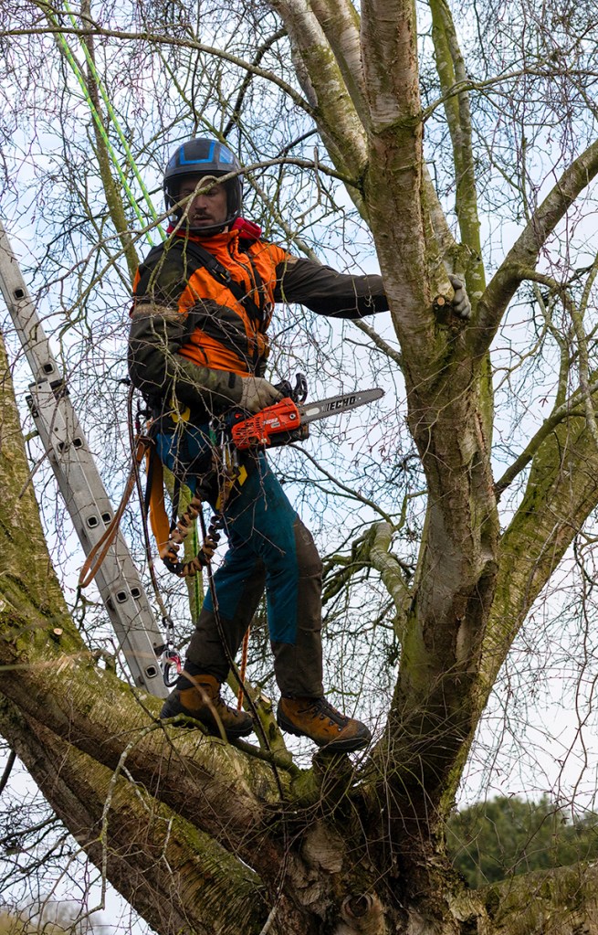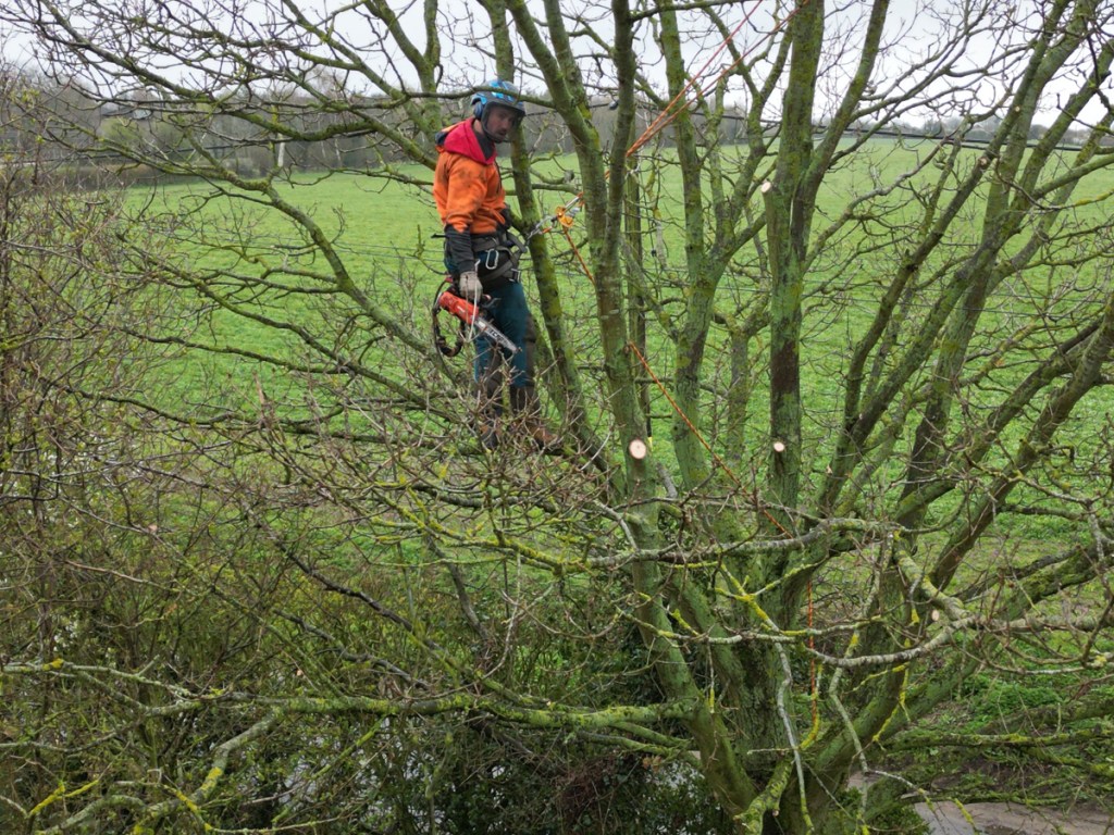 A couple of weeks ago it was decided that some of the trees in our garden were getting a bit heavy – too many branches and leaves. They were making our dwelling a bit dark and gloomy. A local tree surgeon agreed to help and went climbing.